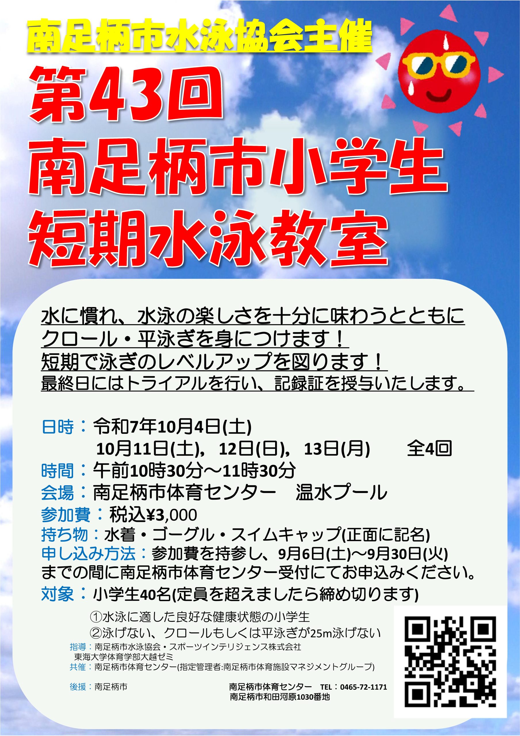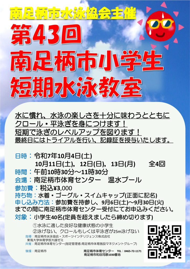第43回南足柄市小学生短期水泳教室(10月4日(土)、 11日(土)、12日(日)、13日 (月、祝日) 全4回)を開催します!